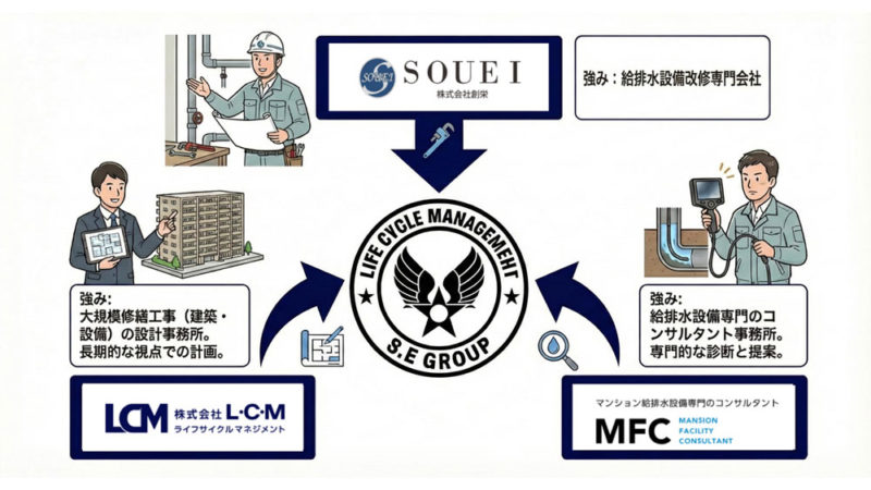 SEグループは、「マンション管理組合の最良のパートナーであること」を理念に掲げ、管理組合の資産価値の最大化と持続的な運営サポートを実現するために結成された専門性の高いグループです。